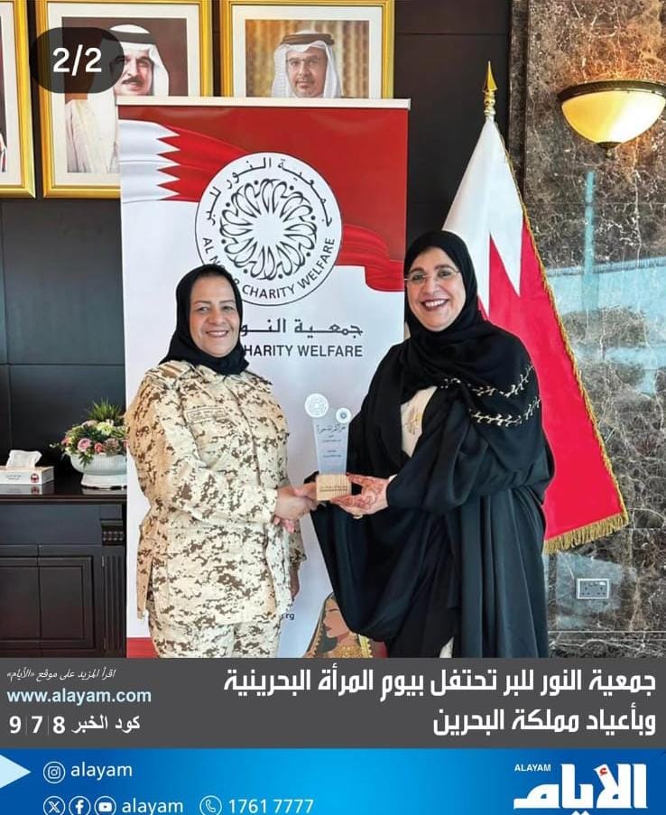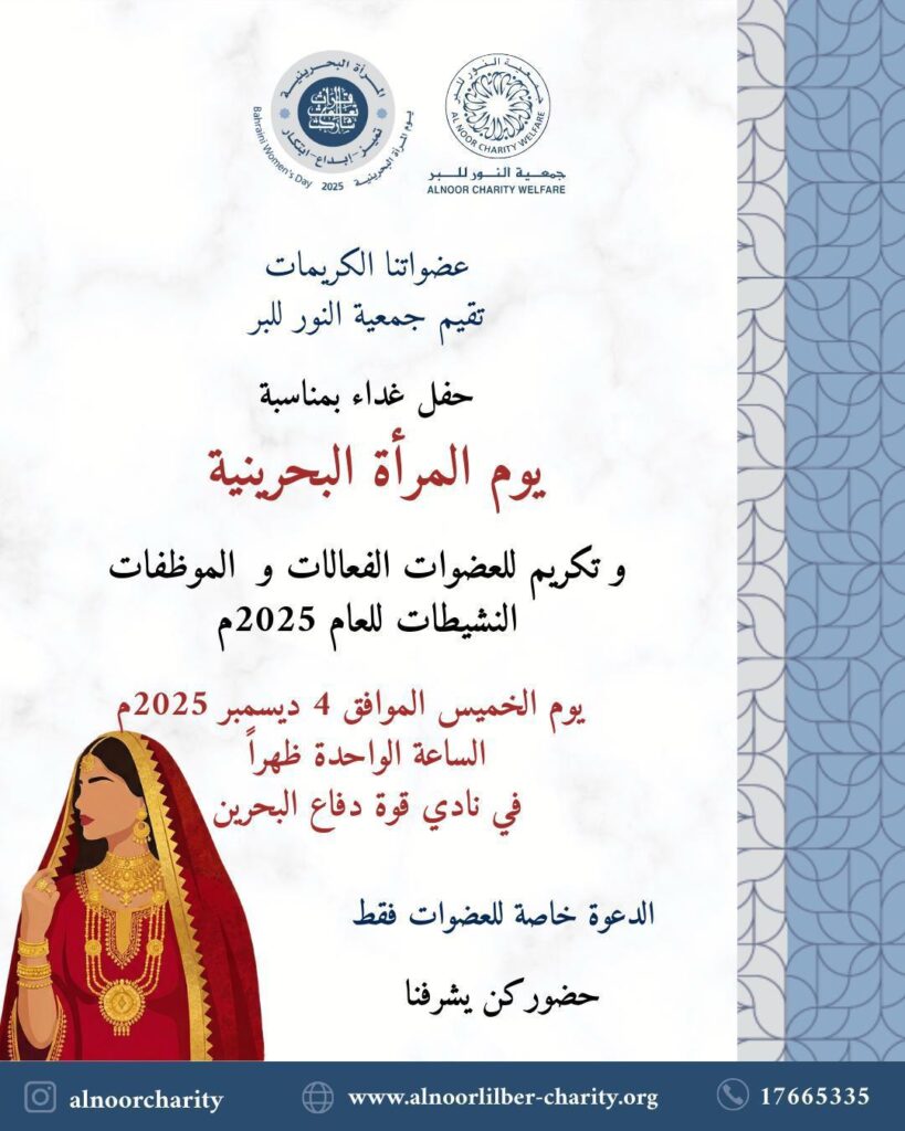 برعاية كريمة من الشيخة لمياء بنت محمد بن خليفة آل خليفة رئيسة جمعية النور للبر، وبحضور الشيخة لولوة بنت خليفة بن علي آل خليفة نائبة الرئيسة، اقامت الجمعية احتفالا كبيرا بمناسبة حلول العيد الوطني لمملكة البحرين واحتفاء بيوم المراة البحرينية، وذلك مساء يوم الخميس بتاريخ 4 ديسمبر 2025 في نادي ضباط قوة دفاع البحرين، وسط مشاركة واسعة من عضوات وموظفات الجمعية ،